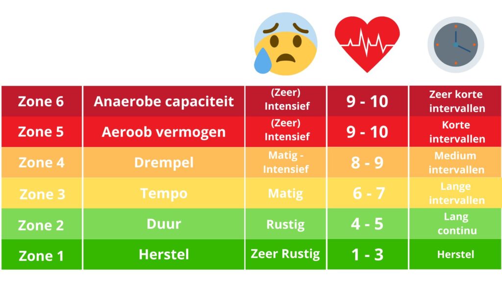Elk van deze zones wordt bepaald aan de hand van jouw maximaaltest en markeert een overgang in de manier waarop jouw lichaam de benodigde energie vrijmaakt. Deze veranderingen koppelen we aan de intensiteit, zodat jij de zones gemakkelijk tijdens jouw trainingen kunt gebruiken. Afhankelijk van het type training kun je dan eenvoudig gebruik maken van hartslag, vermogen of looptempo om de juiste trainingsintensiteit aan te houden!